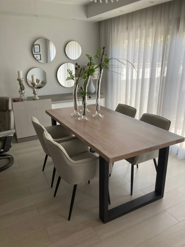 • Mesas de comedor o centro: Con bases sólidas que contrastan bellamente con tapas de cristal o madera.