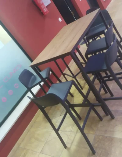 - Muebles para negocios: Barras, mostradores, mesas altas, sillas, estanterías industriales, etc.